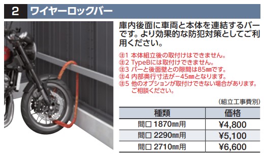 オプション バイク保管庫 FM型 ワイヤーロックバー 間口 2210mm用